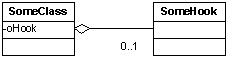 Using UML notation, Figure 1 illustrates an atomic concept of object-oriented software: two separate classes with a one-way, 1:1 relationship between them. In this case, SomeClass holds a reference to SomeHook through the SomeClass.oHook member property
