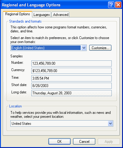 - Click "Ok" to close the Regional and Language Options window. A system restart may be required for these settings to take effect.